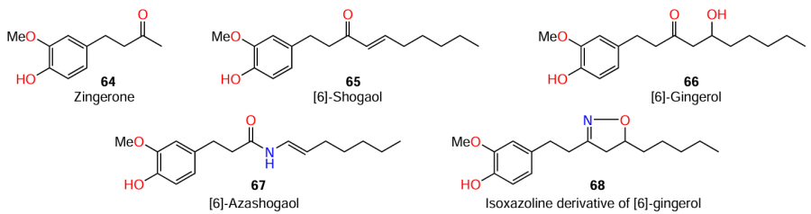 Apart from thymol (11), which was mentioned above, structural analogues of AHLs were found among phenol derivatives; an example is zingerone (64) isolated from ginger (Zingiber officinale). This plant is an extremely popular spice and has antimicrobial properties,[80][81] which makes it applicable in folk medicine.[82][83] Kumar and co-workers[84][85] suggested that there may be QS inhibitors among biologically active ginger components 64 – 68. Indeed, zingerone (64), a major aromatic component isolated from the dried ginger root, showed a high level of quorum sensing inhibition in P. aeruginosa PAO1 strain: in the presence of this phenol, the numbers of so-called swimming, swarming, and twitching phenotypes were found to decrease. In addition, the authors observed decreasing biofilm formation and production of virulence factors such as rhamnolipid, elastase, protease, pyocyanin, and cell-free and cell-bound hemolysin.[85]