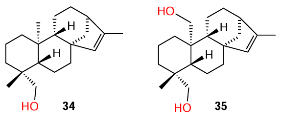 While investigating Senegalia nigrescens species, Bodede et al.,[9] in addition to isolation of known ent-kaur-15-en-18-ol (34), were able to isolate for the first time a new ent-kaurene diterpenoid, ent-kaur-15-ene-18,20-diol (35); the properties of the new product were described in detail. The isolated compounds proved to be relatively weak QS inhibitors: according to the results of the violacein inhibition assays, they demonstrated inhibition rates of 41.8% and 26%, respectively, at a concentration of 700 μg mL–1. The authors noted that the additional loading of functional groups on the kaurene pharmacophore leads to a decrease in the anti-quorum sensing activity.
