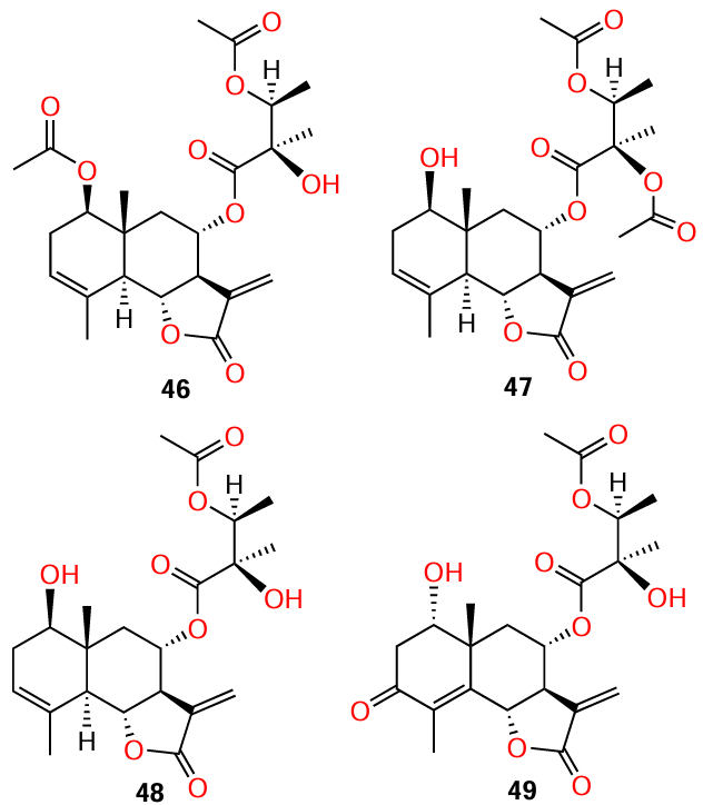 Four sesquiterpene lactones (46 – 49) were isolated[13] from the plant Vernonia blumeoides of the Asteraceae family, known for a broad range of biological activity,[73] and the antibacterial properties of the lactones were described.[74] Subsequently, the authors investigated the anti-quorum sensing activity of blumeoidolides A (46) and B (47) using violacein production assay and agar diffusion assay with three biosensor systems.[13] However, QS inhibitory effect of lactones 48 and 49 could not be assessed due to their insufficient quantity.
