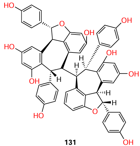 Another resveratrol tetramer that exhibited anti-quorum sensing activity [inhibition of type III secretion systems (T3SS)] against Gram-negative microorganisms, P. aeruginosa and Yersinia pseudotuberculosis, is (−)-hopeaphenol (131).[106] At concentrations from 3.3 to 100 mM, compound 131 exhibited dose-dependent and irreversible inhibition of the secretion of Yops (Yersinia outer proteins), which are effector proteins of Yersinia pseudotuberculosis. At the same concentration, this tetramer also inhibited T3SS of the P. aeruginosa superbug.