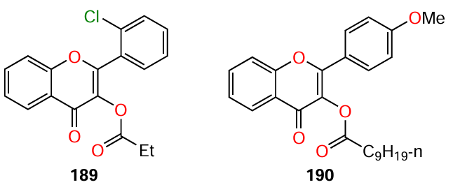 Manner and Fallarero,[122] who searched for effective QS inhibitors, selected two lead compounds 189 and 190, which inhibited the violacein production in C. violaceum ATCC 31532 by > 90 and > 83.5%, respectively, when used at a concentration of 40 mM. It can be seen that the two flavonoids have a structural similarity, in particular, they contain side chains in the acyl substituent of ring C and, hence, they can be regarded as AHL analogues.