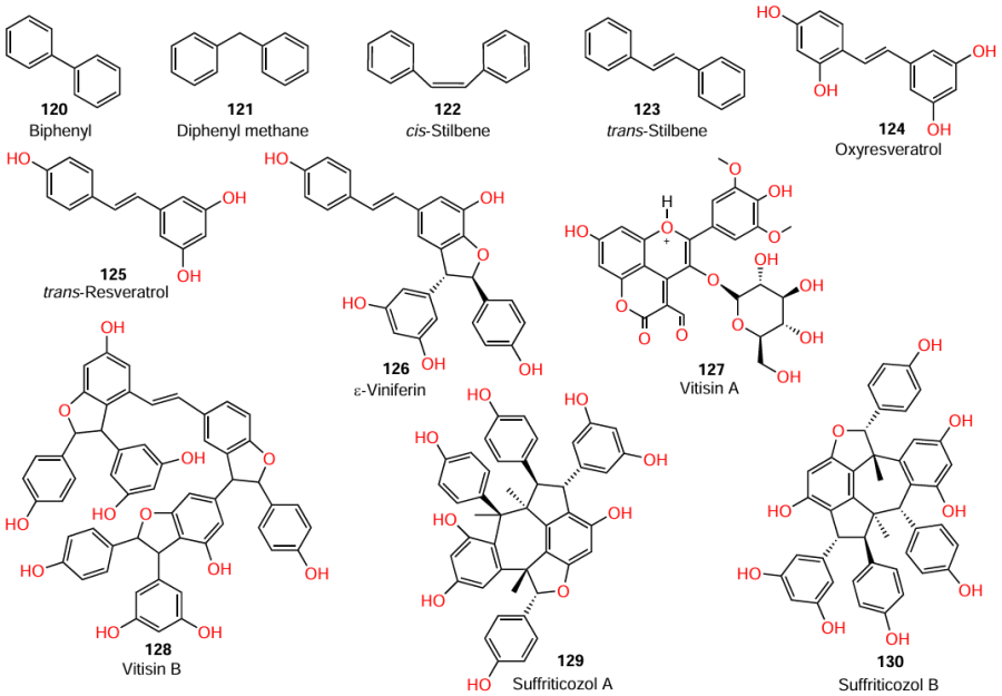 It is also important that resveratrol oligomers, ε-viniferin (126), vitisin A (127), vitisin B (128), suffriticosol A (129), and suffriticosol B (130), also have anti-hemolytic activity against S. aureus, with tetramer 128 being the most active out of the five compounds, providing > 70% and > 95% inhibition of hemolysis at concentrations of 1 and 2 μg mL–1, respectively.