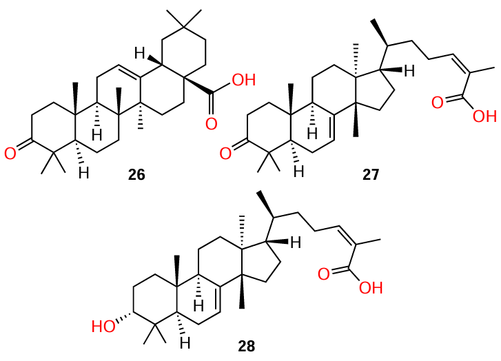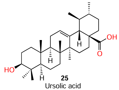 Despite the fact that compound 24 has no structural similarity to AHL, it is a biosynthetic precursor of ursolic acid (25) (see also Section 3.2).[65] This triterpene acid is well known by its antibacterial activity[66] and the ability to inhibit the biofilm growth by a mechanism unrelated (at least, partially) to the influence on QS. This circumstance distinguishes the mechanism of action of ursolic acid from that of α-amyrin, which does not have a bactericidal activity.[67]