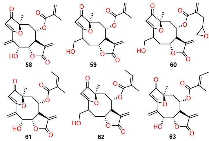 Amaya et al.[77] isolated the sesquiterpene lactones 58 – 63 from the plant Centratherum punctatum. Among these compounds, goyazensolide type lactones (59, 60, and 62) showed a higher quorum quenching activity: inhibition of biofilm formation, AHL production, and P. aeruginosa elastase activity compare to isogoyazensolide type lactones (58, 61, and 63) (Table 10). The activity of the former proved to be comparable with that of other sesquiterpene lactones of higher plants[78] and synthetic N-sulfonyl homoserine lactones described by Castang et al.[79]