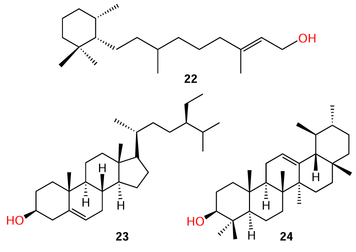 Rasamiravaka et al.[64] isolated three terpenoids, cassipourol (22), β-sitosterol (23), and α-amyrin (24), from the plant Platostoma rotundifolium. The extensive study of quorum sensing inhibition for these terpenoids included their effect on the QS-dependent expression of the lasB and rhlA genes, expression of the lasI/R and rhlI/R genes, production of virulence factors related to the quorum sensing, biofilm formation, and the ability to decrease the production of extracellular polysaccharides and suppress the expression of the regulatory pelA gene in P. aeruginosa. It is important to note that the authors showed the absence of any antibacterial activity for all three isolated compounds and found that their biological effect is attributable to quorum sensing inhibition alone, without bactericidal (bacteriostatic) action.