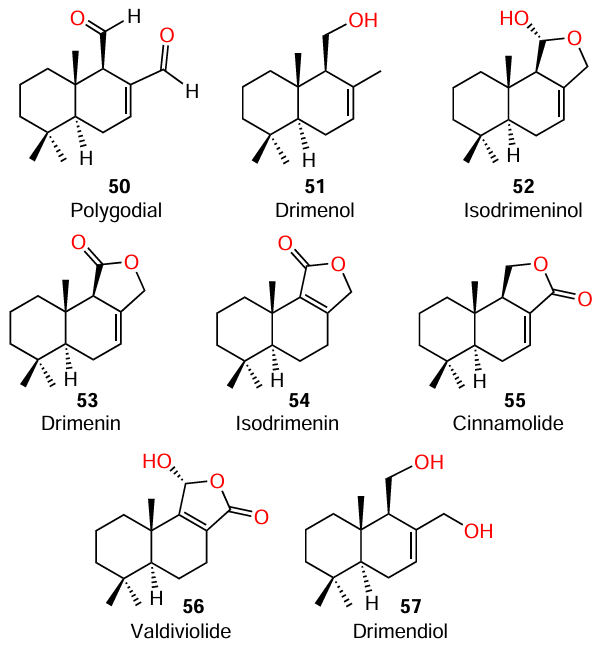Paz and co-workers[75][76] investigated the extracts of 15 Chilean endemic plants for the presence of QS inhibitors in them; the extracts of only three representatives (Drymis winteri J.R., Psoralea glandulosa L., and Peumus boldus) were found to be active against the reporter strain of C. violaceum ATCC 12472. Eight drimane sesquiterpenoids (50 – 57) were isolated from the bark of the most active tree, Drimys winteri.