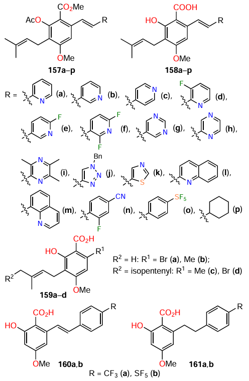 Hunag et al.[114] synthesized 24 cajaninstilbene acid derivatives 157 – 161 and studied the structure – activity relationships in relation to the anti-biofilm activity for P. aeruginosa bacterium. Of this series, only compounds 158g,m,o considerably inhibited the biofilm formation (Table 16), with 158o being most active: the inhibition rate was 50% at a concentration of 50 mM. The other compounds either had a weak inhibitory effect or, conversely, promoted biofilm formation. Compound 158o also inhibited the expression of las and pqs systems, which, in turn, resulted in a decrease in the production of virulence factors: elastase, pyocyanin, and pyoverdine.