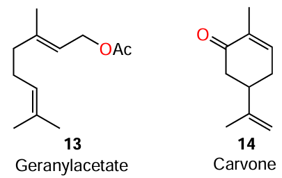 Similarly to the above example, despite the presence of ten carbon atoms, limonene (8) and carvone (14) molecules are more compact owing to the six-membered ring, and this accounts for the capability of competitive inhibition of quorum sensing mediated by 3-oxo-C6-AHL.[61]