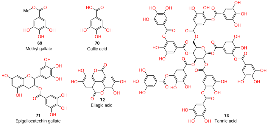 Hossain et al.[86] investigated series of tannins, among which only methyl gallate (69) exhibited quorum sensing inhibitory activity against C. violaceum and P. aeruginosa. Since the unsubstituted precursor, gallic acid (70), was inactive,[87][88] the authors assumed that the presence of the gallic moiety in the molecule was insufficient for the compound to exhibit anti-quorum sensing activity.