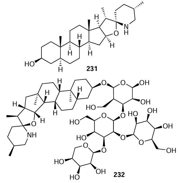 Although the boundary between alkaloids and nitrogen-containing natural compounds (or biogenic amines) is vague, alkaloids are defined, most often, as naturally occurring azaheterocyclic compounds (mainly isolated from plants) that possess basic properties and high physiological activity. Although the antibacterial action of alkaloids is mentioned in a large number of review articles (e.g., a review by Cushnie et al.[133]), there are currently almost no published data on the structure – activity relationship with regard to the QS inhibition for alkaloids. An exception is the paper by Mitchell et al.,[134] who found that tomatidine (231) at a concentration of 12.8 mg L–1 markedly inhibits the hemolytic activity and the expression of agr-regulated genes (hla, hld, geh, nuc, plc, and splC) responsible for the production of virulence factors in various strains of S. aureus. At the same time, its glycosylated derivative, tomatine (232), has virtually no inhibitory effect.[134]