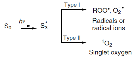 The principle of operation of this method is based on three main constituents: light irradiation, photosensitizer, and oxygen. Under particular irradiation conditions, the photosensitizer is activated, being excited from the singlet ground state to a triplet excited state, and then undergoes various photochemical reactions, which are subdivided into two main types, to give highly toxic reactive oxygen species. The mechanism of type I reactions includes electron or hydrogen atom transfer directly from the phorosensitizer to biomolecules to give free radicals and radical ions, which react with molecular oxygen to give reactive oxygen species including hydrogen peroxide, superoxide anions, and hydroxyl radicals. Type II reactions include direct energy transfer from the photosensitizer in the triplet state to molecular oxygen, giving rise to reactive electrophilic singlet oxygen (Scheme 1).[233]