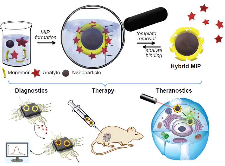 The integration of MIPs with inorganic nanoparticles provides the fabrication of complex materials that combine targeting, imaging, and drug delivery functions, and in some cases, therapeutic action, owing to the ability of NPs to respond to external physicochemical stimuli. Hybrid MIPs exhibit high specificity of molecular template binding and chemical and mechanical stability, which makes them promising therapeutic and diagnostic tools. MIPs can be used as specific drug carriers, providing gradual and controlled drug release in the body, and the properties of the inorganic material present in the hybrid system allow for the use of photothermal and photodynamic therapy approaches, which increases the efficiency of therapy and reduces the side effects.