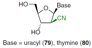 Under similar conditions (see Scheme 13), 1-(2'-C-cyano-2'-deoxy-β-D-arabinofuranosyl) derivatives of uracil (79) and thymine (80) were obtained.[69]