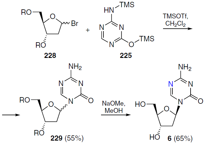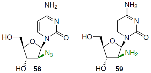 The synthetic approach to 1-(2'-deoxy-β-D-arabinofuranosyl)cytosines with azide (58) and amino groups (59) at position 2' involved the condensation of 5-O-benzoyl-3-O-acetyl-2-azido-3-deoxy-D-arabinofuranosyl chloride[63] with trimethylsilylated cytosine. This gave a mixture of α- and β-anomers, with the isolated yield after chromatographic separation of 9 and 39%, respectively. The protecting groups were removed by treatment with K2CO3 in methanol to afford the target 1-(2'-azido-2'-deoxy-β-D-arabinofuranosyl)cytosine 58.[63] Reduction of the latter on 5% Pd/C gave the 2'-amino-2'-deoxy derivative 59 in 83% yield.[64]