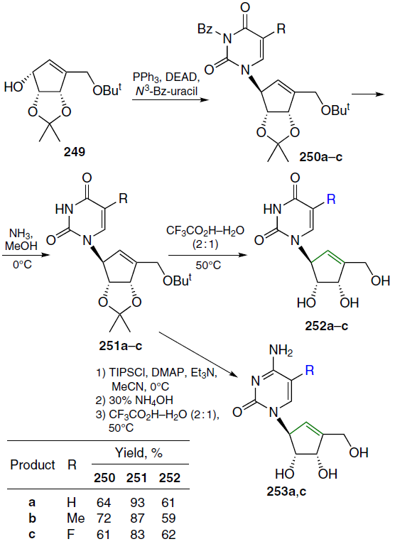 Song et al.[202] synthesized the optical isomer of compound 241, as well as 5-methyl- and 5-fluoro-substituted (1'S,2'R,3'S)-1-[2,3-dihydroxy-4-(hydroxymethyl)-4-cyclopenten-1-yl]pyrimidines shown in Scheme 50. The key step involved the condensation of cyclopentene 249 with N-benzoylated pyrimidine bases to form protected carbocyclic analogues 250a – c. The condensation was carried out using the Mitsunobu reaction: cyclopentenyl alcohol 249 was treated with N3-benzoyluracil,[203] N3-benzoylthymine,[203] or N3-benzoyl-5-fluorouracil[204] in the presence of DEAD and Ph3P in THF at room temperature. Debenzoylation of compounds 250a – c with saturated ammonia in MeOH delivered products 251a – c, and subsequent removal of the protecting groups (tert-butyl and isopropylidene) with aqueous trifluoroacetic acid at 50°C afforded carbocyclic analogues 252a – c. Protected uridine analogues 251a and 5-fluorouridine 251c were converted to the corresponding cytosine and 5-fluorocytosine derivatives using the described method,[205] followed by deprotection to isolate the cytosine (253a) and 5-fluorocytosine nucleosides (253c).