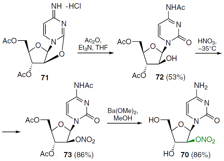 In order to overcome the susceptibility of cytarabine (1) to enzymatic deamination and thereby prevent its deactivation, 2'-O-nitro-β-D-arabinofuranosylcytosine (70) was prepared.6[67] The first step of the reaction sequence shown in Scheme 12 comprised treating the starting 2,2'-anhydro-1-(3',5'-di-O-acetyl-β-D-arabinofuranosyl)cytosine hydrochloride (71) with acetic anhydride in THF in the presence of triethylamine, which led to 1-(3',5'-di-O-acetyl-β-D-arabinofuranosyl)-N4-acetylcytosine (72) in moderate yield. Esterification of compound 72 was accomplished with concentrated nitric acid at a temperature from –30 to –35°C, yielding 1-(3',5'-di-O-acetyl-2'-O-nitro-β-D-arabinofuranosyl)-N4-acetylcytosine (73). Deacetylation of compound 73 with barium methoxide in methanol gave the target nucleoside, 1-(2'-O-nitro-β-D-arabinofuranosyl)cytosine (70), in high yield.