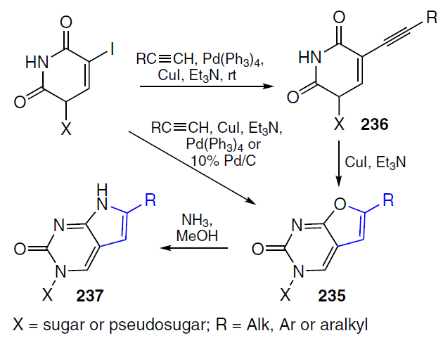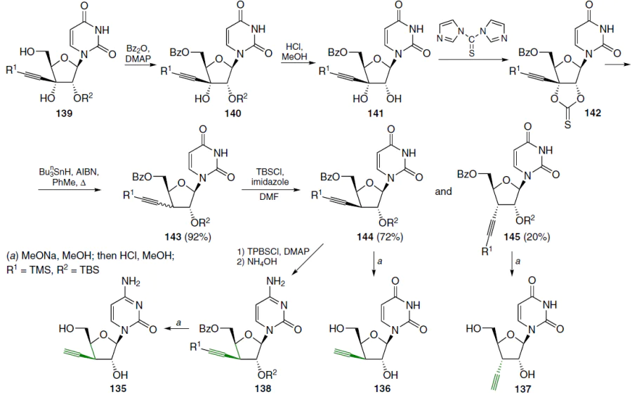 Ribonucleoside analogues were also synthesized: 4'-C-ethynyluridine (206), 4'-C-cyanouridine (207), 4'-C-ethynylcytidine (208) and 4'-C-cyanocytidine (209).
