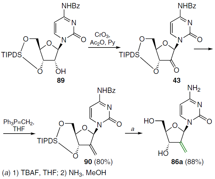 An alternative method for the synthesis of compound 86a is shown in Scheme 16. The starting N4-benzoyl-1-[3',5'-O-(tetraisopropyldisiloxane-1,3-diyl)-β-D-ribofuranosyl]cytosine (89) was oxidized[73] with the CrO3 – Py – Ac2O system (molar ratio 1 : 2 : 1) in dichloromethane, which led to the formation of the 2'-keto derivative 43, which was condensed with methylenetriphenylphosphorane in THF. In this case, compound 90 was isolated, and its deprotection with TBAF in THF followed by treatment with NH3 in MeOH gave the target nucleoside 86a.74