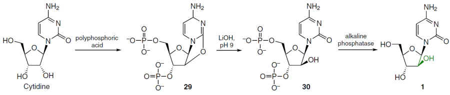 1-β-D-Arabinofuranosylcytosine (cytarabine, ara-C, 1)[41] (see Fig. 5) is one of the most potent drugs for the treatment of human acute myeloid leukemia, erythromyelosis, neuroleukemia and non-Hodgkin's lymphoma.[42-44] Cytarabine (1) was first synthesized by the Dekker's group[45] in 1959 (Scheme 2). Cytidine reacted with polyphosphoric acid to give 3',5'-O-diphosphorylated 2,2'-O-cyclocytidine 29, which was hydrolyzed with lithium hydroxide (pH 9) to afford cytarabine-3',5'-diphosphate 30. To obtain the target product 1, the phosphate groups were then removed by enzymatic hydrolysis with alkaline phosphatase.