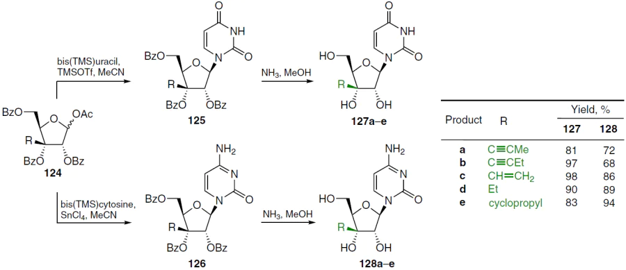 A further development of this area was the synthesis of uridine and cytidine derivatives containing propyn-1-yl, butyn-1-yl, vinyl, cyclopropyl, and ethyl groups at position 3'.[103] The synthesis of such compounds, shown in Scheme 23, involved the condensation of silylated uracil or cytosine with acylated sugar 124 in acetonitrile in the presence of TMSOTf (in the case of uracil) or SnCl4 (in the case of cytosine), followed by deprotection of intermediates 125 and 126 with NH3 in methanol. This gave 3'-C-substituted uridine derivatives 127a – e (yield 81 – 98%) and cytidine derivatives 128a – e (yield 68 – 94%).