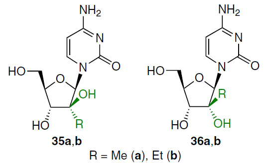 Another trend for optimizing the anticancer properties of cytarabine (1) is the synthesis of 2'-alkyl analogues 35a,b, 36a,b.