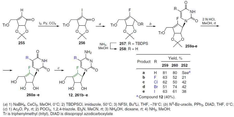 Iodination of cyclopentenone 255 with iodine in the presence of pyridine in CCl4 proceeded slowly, but when the solvent was replaced with THF, iodocyclopentenone 256 was obtained in fairly good yield. Reduction of this compound with sodium borohydride in the presence of cerium chloride, followed by protection of the hydroxyl group with a tert-butyldiphenylsilyl moiety, yielded a TBDPS ester, in which electrophilic substitution of the iodine atom by fluorine was achieved by the sequential addition of BunLi and N-fluorobenzenesulfonimide (NFSI) at –78°C. The resulting fluorocyclopentene 257 was then desilylated to form the key intermediate 258.[207] Condensation of the latter with N3-benzoyluracil under standard Mitsunobu reaction conditions[208] afforded uracil derivatives 259a – e. Treatment of these compounds with hydrochloric acid solution delivered uracil derivatives 260a – e.