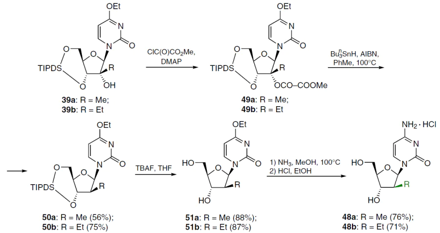 The synthesis of 2'-deoxy-2'-C-methyl- and 2'-deoxy-2'-C-ethylcytidines 48a,b is described. The hydroxyl group in the starting nucleosides 39a,b was deoxygenated with methyl oxalyl chloride in acetonitrile in the presence of two equivalents of 4-dimethylaminopyridine (DMAP). Thus obtained 2'-O-methyloxalyl esters 49a,b were heated without further purification in toluene at 100°C for 1 h in the presence of tri-n-butylstannane and azabis(isobutyronitrile) (AIBN) to give 2'-deoxy derivatives 50a,b in moderate yields. These compounds were then treated with TBAF in THF at room temperature to form nucleosides 51a,b in high yield. Further heating at 100°C of a solution of nucleosides 51a,b in methanol saturated with NH3 in sealed tubes for 2 days, followed by treatment of the residues dissolved in ethanol with a 2 M HCl solution gave the target products 48a,b in the form of hydrochlorides (Scheme 7).[61][62]