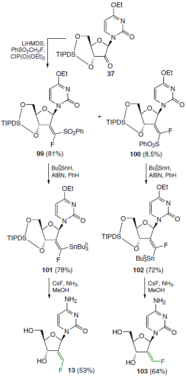 Using the Horner – Wittig reaction (or Julia – Lythgoe reaction), 2'-ketonucleoside 37 was converted into a mixture of easily separated fluorovinyl sulfones 99 (predominant product) and 100 (by-product). Next, two equivalents of tri-n-butylstannane were added to these compounds to obtain (fluorovinyl)stannanes 101 and 102 in good yields. Analysis of the crude reaction mixtures by 19F NMR spectroscopy confirmed the selectivity of the reaction, showing the absence of isomer 101 in product 102 and vice versa. Then (E)-2'-deoxy-2'-(fluoromethylidene)cytidine (13) was synthesized directly from compound 101 by treating it with a CsF – NH3 – MeOH mixture. (Z)-2'-Deoxy-2'-(fluoromethylidene)cytidine (103) was prepared from compound 102 under similar conditions (Scheme 19).[78]
