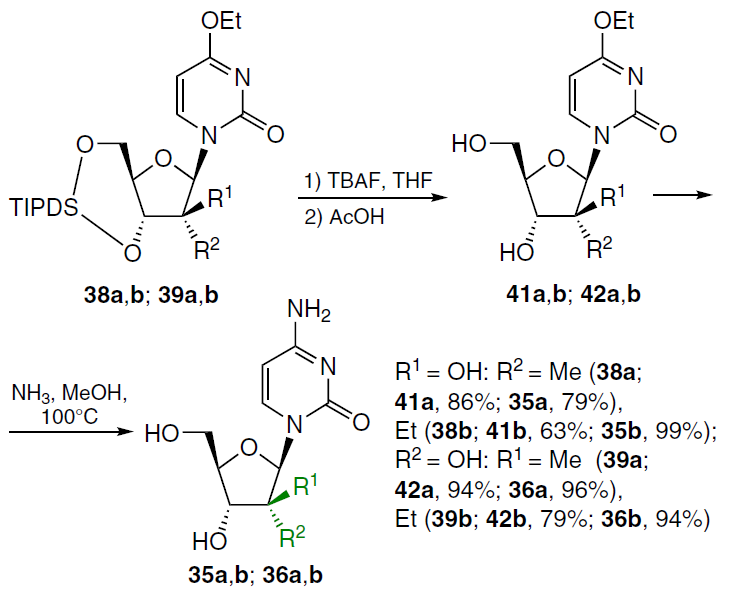Removal of the tetraisopropyldisiloxanyl-1,3-diyl (TIPDS) protecting group in compounds 38a,b with tetra-n-butylammonium fluoride (TBAF) in THF followed by heating of intermediates 41a,b in methanol saturated with NH3 at 100°C in a sealed vial gave the corresponding 2'-alkyl-1-(arabinofuranosyl)cytosines 35a,b (Scheme 5).[58] Under similar conditions, compounds 39a,b were deprotected to afford 4-ethoxy-substituted 2'-methyl- (42a) and 2'-ethyl-β-D-ribofuranosylpyrimidin-2(1H)-ones (42b) in 94% and 79% yield, respectively. Ammonolysis of compounds 42a,b under the conditions described above furnished 2'-C-methyl- (36a) and 2'-C-ethyl derivatives (36b) in high yields.