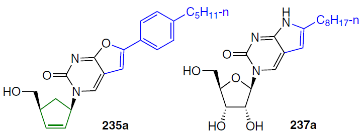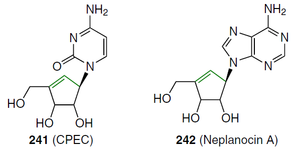 The cytotoxic drug cyclopentenylcytosine (CPEC, 241) was developed in 1979 as a cytosine-containing analogue of neplanocin A (242), a biologically active and toxic nucleoside isolated from natural sources. Among its purine and pyrimidine analogues, neplanocin A has proven to be the most potent in terms of antiviral activity and activity against murine leukemia and human tumour xenografts.[198]