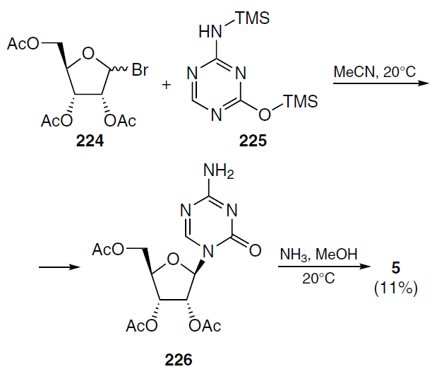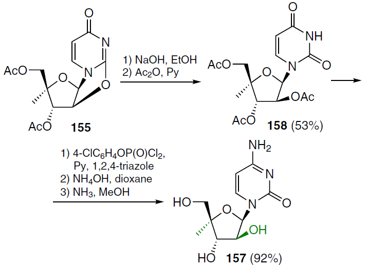The reaction sequence used to prepare 1-(4'-C-methyl-β-D-arabinofuranosyl)cytosine (157) is shown in Scheme 28.[129] The starting 3',5'-di-O-acetyl-4'-C-methyl-2,2'-anhydrouridine (155) was treated sequentially with 1N NaOH in ethanol and acetic anhydride in pyridine to afford 1-(2',3',5'-tri-O-acetyl-4'-C-methyl-β-D-arabinofuranosyl)uracil (158) in moderate yield. The latter was treated with 4-chlorophenyl phosphorodichloridate in the presence of 1,2,4-triazole, followed by reaction with NH4OH-dioxane and then with NH3 in MeOH gave the desired nucleoside 157 in high yield.[129]