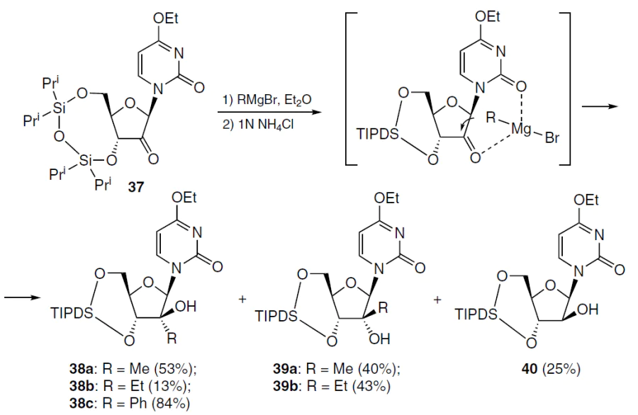 The synthesis of these compounds commenced with the treatment of 3',5'-protected 2'-keto-nucleoside 37 with alkyl magnesium bromide in diethyl ether while cooling under argon (Scheme 4).[58] The use of methyl magnesium bromide at ‒78°C led to a mixture of epimers 38a and 39a, while ethyl magnesium bromide at ‒50°C afforded a mixture of three nucleoside analogues (38b, 39b, and 40). Upon treatment of compound 37 with phenyl magnesium bromide at ‒78°C, the major product 38c was isolated in 84% yield, which is apparently due to steric hindrance when using a bulkier substituent.