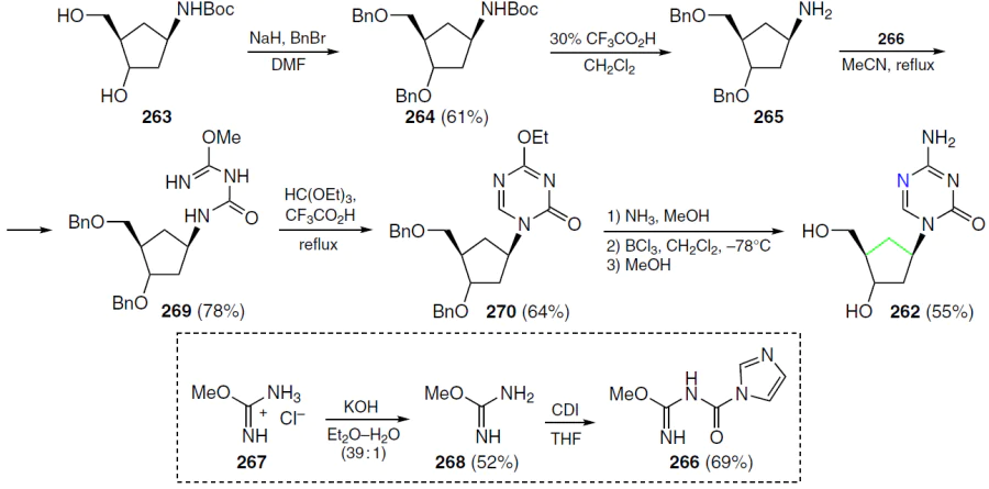 The synthesis of a carbocyclic analogue of decitabine (cAzadC, 262) has been reported (Scheme 52).[214] The hydroxyl groups of the starting NHBoc-cyclopentane 263 (Boc is tert-butoxycarbonyl) were protected with benzyl groups, and then the Boc protection was removed from the amino group of intermediate 264 using trifluoroacetic acid. Compound 265 with the free amino group was reacted with methyl (1H-imidazole-1-carbonyl)carbaimidate (266), which was prepared from isomethylurea hydrochloride 267 via the formation of free base 268 with potassium hydroxide and its subsequent reaction with carbonyldiimidazole (CDI). The reaction of compounds 265 and 266 yielded the carbamoylurea-cyclopentane analogue of nucleoside 269, which was cyclized to triazine base 270 using triethyl orthoformate. The reaction of compound 270 with NH3 in methanol and deprotection with BCl3 in dichloromethane, followed by treatment with MeOH, column chromatography, and recrystallization from MeOH afforded the target product 262.