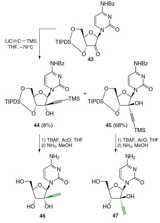 In addition to the above-mentioned 2'-alkylated analogues of cytarabine (1), derivatives with an ethynyl substituent at this position were synthesized. Two approaches to their preparation were proposed. Thus, the reaction of 1-[3',5'-O-[1,1,3,3-tetraisopropyldisiloxane-1,3-diyl]-β-D-erythrofuranosyl]uracil and LiC≡CR gave predominantly the α-adduct.[59] Treatment of the N4-benzoylcytosine derivative 43 with LiC≡CTMS in THF at ‒78°C led to a mixture of β- (44) and α-adducts (45), which was separated by column chromatography on silica gel, eluting with ethyl acetate in hexane with a concentration gradient (Scheme 6).[60] The silyl protection in the resulting intermediates was removed in the usual manner and the corresponding free nucleosides 46 and 47, respectively, were isolated.