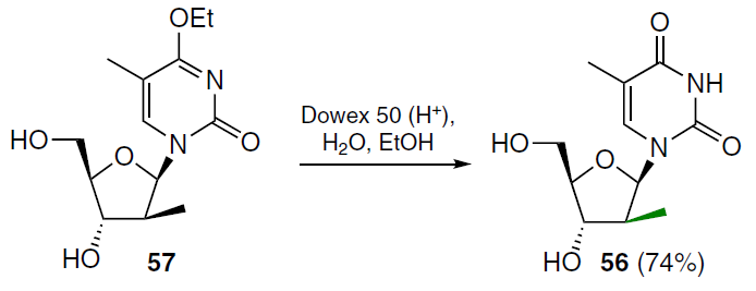 (2'S)-2'-C-Methylthymidine 56 was obtained by acid hydrolysis of 4-ethoxy-5-methyl-1-(2'-deoxy-2'-C-methyl-β-D-arabinofuranosyl)-2(1H)-pyrimidinone (57) in an aqueous–alcoholic medium (Scheme 9).[62]