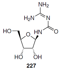 The drug CPEC (241), in contrast to the inactive carbocyclic uracil derivative 247, showed significant cytotoxicity against the L1210 cell line, inhibiting cell growth by 58% at a concentration of 30 μM.[199] The efficiency of compound 241 was subsequently confirmed against various tumours, including neuroblastoma, but it did not find clinical use due to neurotoxicity.[201]