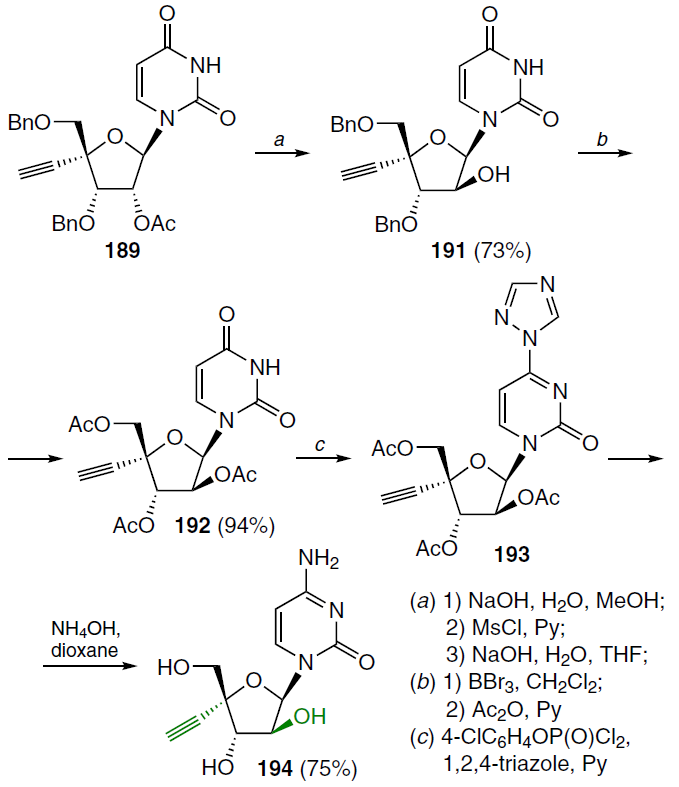 The second step in the synthesis of the target nucleosides involved the transformation of the ribofuranosyl moiety of compound 189 into an arabinoside (Scheme 36).[136] For this purpose, nucleoside 189 was successively subjected to alkaline hydrolysis, treatment with MsCl in pyridine, and a NaOH solution in aqueous THF, which afforded 1-(4'-C-ethynyl-β-D-arabinofuranosyl)uracil (191) in good yield. Further reaction with BBr3 in dichloromethane and subsequent acetylation gave the 2',3',5'-tri-O-acetyl derivative 192, which was treated with 4-chlorophenyl phosphorodichloridate and 1,2,4-triazole in pyridine to form the corresponding 4-triazole derivative 193. The latter was converted to the target 1-(4'-C-ethynyl-β-D-arabinofuranosyl)cytosine (190) under basic conditions.