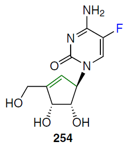 Nucleoside analogues 252 and 253 were shown to lack cytotoxicity against CEM cells. Under the same conditions, 1-[4,5-dihydroxy-3-(hydroxymethyl)-2-cyclopenten-1-yl]cytosine 241 exhibited high cytotoxicity (IC50 = 0.08 μM), while its 5-fluoro-containing analogue 254 was found to be inactive (IC50 = 51.8 μM).[202]