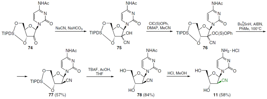 The synthesis of 1-(2'-C-cyano-2'-deoxy-β-D-arabinofuranosyl)cytosine (CNDAC, 11) was started by treating N4-acetyl-1-[3',5'-O-(tetraisopropyldisiloxane-1,3-diyl)-β-D-erythrofuran-2-ylosyl]cytosine (74) with sodium cyanide in the presence of NaHCO3 in a diethyl ether–water mixture (Scheme 13).[68] This afforded epimeric 2'-cyanohydrins 75, which were then reacted with phenyl chlorothiocarbonate in the presence of DMAP in acetonitrile. Deoxygenation of intermediate 76 was carried out by treatment with tri-n-butylstannane and 2,2'-azobis(isobutyronitrile) in toluene at 100°C. According to NMR spectroscopy data (nuclear Overhauser effect (NOE) experiments), radical deoxygenation proceeds stereospecifically to form arabinonucleoside 77, apparently due to the steric hindrance at the β-position. Desilylation of compound 77 with TBAF in the presence of acetic acid in THF afforded the N4-acetyl derivative 78 in high yield. Further treatment of the reaction mixture with HCl in MeOH at room temperature yielded 1-(2'-C-cyano-2'-deoxy-1-β-D-arabinofuranosyl)cytosine (11) as hydrochloride.[68]
