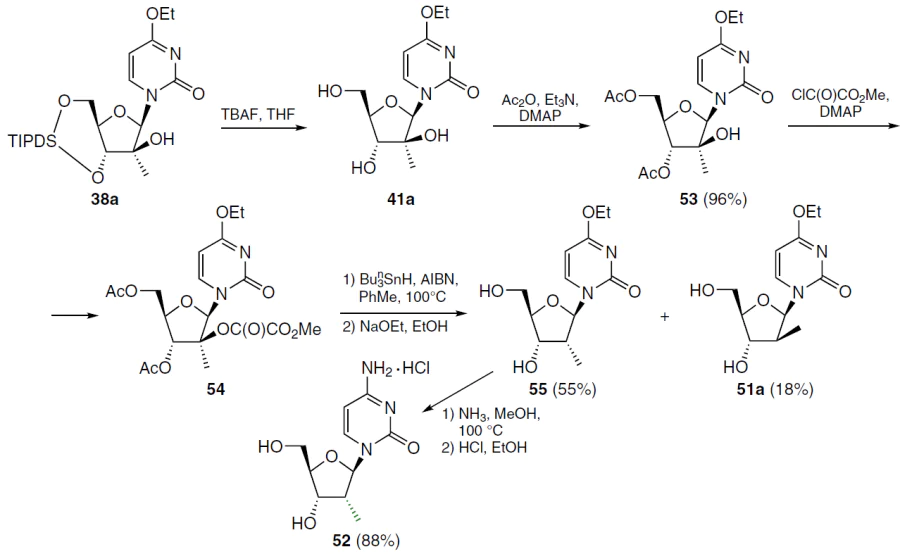 When nucleoside 38a was deoxygenated under the conditions shown in Scheme 7, the corresponding ester was isolated in very low yield, apparently due to steric hindrance during esterification. For this reason, 2'-deoxy-2'-C-methylcytidine (52) was obtained using a less bulky protecting group (Scheme 8).[62] Thus, nucleoside 38a at room temperature was treated with TBAF in THF, which furnished 4-ethoxy-1-(2'-C-methyl-β-D-arabinofuranosyl)-2(1H)-pyrimidinone (41a), which was acetylated with acetic anhydride in the presence of triethylamine and DMAP. In this case, 3',5'-di-O-acetyl derivative 53 was obtained in high yield, which was condensed with methyl oxalyl chloride in the presence of two equivalents of DMAP. The resulting 2'-O-methyloxalyl ester 54 was heated without further purification at 100°C in toluene for 1 h in the presence of tri-n-butylstannane and AIBN. Subsequent treatment of the deoxygenation product with sodium ethoxide in absolute ethanol gave a mixture of nucleosides 51a and 55, which were chromatographically separated to give the corresponding products in individual form. Ammonolysis of nucleoside 55 and subsequent treatment of the residue with a solution of HCl in ethanol afforded the hydrochloride of the target (2'R)-2'-deoxy-2'-C-methylcytidine (52) in high yield (see Scheme 8).[62]