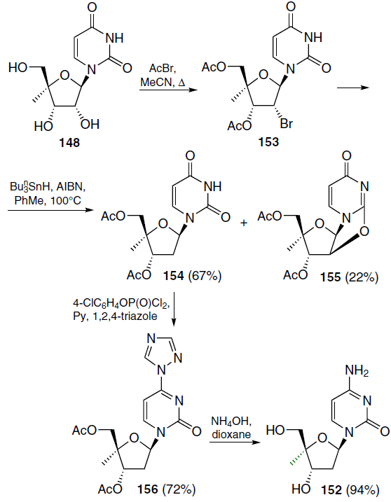 The synthesis of 2'-deoxy-4'-C-methylcytidine (152) commenced with the treatment of the starting 4'-C-methyluridine (148) with excess acetyl bromide in boiling acetonitrile, which furnished 2'-bromo-2'-deoxy derivative 153 (Scheme 27).[129] Heating a solution of compound 153 in toluene in the presence of tributylstannane and AIBN gave a mixture of 3',5'-di-O-acetyl-2'-deoxy-4'-C-methyluridine (154) and 3',5'-di-O-acetyl-4'-C-methyl-2,2'-anhydrouridine (155), with the former predominating. Using the methods described above, nucleoside 154 was converted first to triazolide 156 and then to the target 2'-deoxy-4'-C-methylcytidine (152).