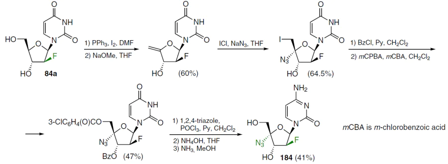 Similarly, azvudine[13] (184) was synthesized from 2'-deoxy-2'-fluoroarabinouridine (84a), obtained in three steps from 1,3,5-tri-O-benzoyl-2-deoxy-2-fluoro-D-arabinofuranoside in 78% yield (Scheme 34).[135]