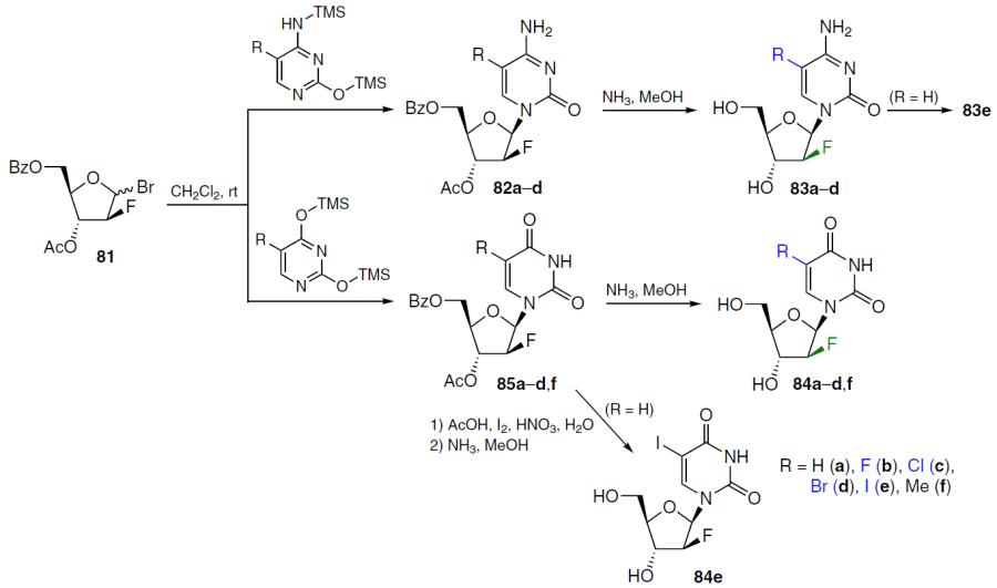 Condensation of 3-O-acetyl-5-O-benzoyl-2-deoxy-2-fluoro-D-arabinofuranosyl bromide (81)[70] with trimethylsilylcytosine or its 5-halo derivatives afforded protected nucleosides 82a – d, which were deprotected by ammonolysis to 2'-F-ara-C-analogues 83a – d (Scheme 14).[71]The 5-iodo derivative 83e was formed by iodination of compound 83a under the following conditions: AcOH, HIO3 , I2 , CCl4 , H2O, 40 – 50°C. Products 84a–d,f were obtained by condensation of bromide 81 with the corresponding trimethylsilyluracils and subsequent deprotection of compounds 85a–d,f. Iodination of nucleoside 85a (R = H) followed by ammonolysis afforded analogue 84e (see Scheme 14).71