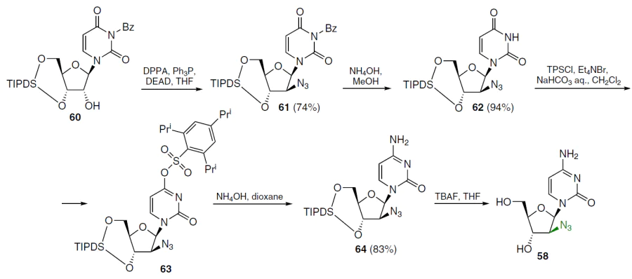 To introduce an azido group at the 2' position of uridine in an alternative method for the synthesis of azido derivative 58, the nucleophilicity of the carbonyl oxygen atom at position 2 was reduced in the first step. For this purpose, benzoyl protection of the N3 group was used.[65] Treatment of protected uridine 60 with diphenyl phosphorazidate (DPPA), triphenylphosphine, and diethyl azodicaboxylate (DEAD) afforded N3-benzoyl-1-(2'-azido-2'-deoxy-3',5'-O-(tetraisopropyl-disiloxane-1,3-diyl)-β-D-arabinofuranosyl)uracil (61) in moderate yield (Scheme 10).[66] After its debenzoylation with NH3 in methanol, 1-(2'-azido-2'-deoxy-3',5'-O-(tetraisopropyldisiloxane-1,3-diyl)-β-D-arabinofuranosyl)uracil (62) was obtained in high yield. Compound 62 was converted to the O4-triisopropylbenzenesulfonate derivative 63 by treatment with 2,4,6-triisopropylbenzenesulfonyl chloride (TPSCl) in dichloromethane and, without further purification, was treated with NH4OH in dioxane to give the cytosine derivative 64 (yield 83% based on compound 62). Deprotection of nucleoside 64 with TBAF in THF gave product 58 in quantitative yield as the hydrochloride.