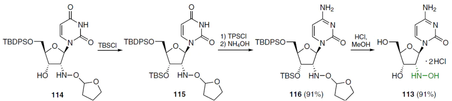 Cytidine analogue 113 was obtained from compound 114, in which the 3'-hydroxy group was first protected with TBS to give derivative 115 (Scheme 21).[79][80] From the latter, by a standard method, which involved the reaction with 2,4,6-triisopropylbenzenesulfonyl chloride in acetonitrile, O4-triisopropylbenzenesulfonate was obtained and converted without further purification into nucleoside 116 by treatment with NH4OH. The protecting groups of compound 116 were removed in a mixture of conc. HCl and MeOH to give 2'-hydroxylamino-2'-deoxycytidine (113) as dihydrochloride.