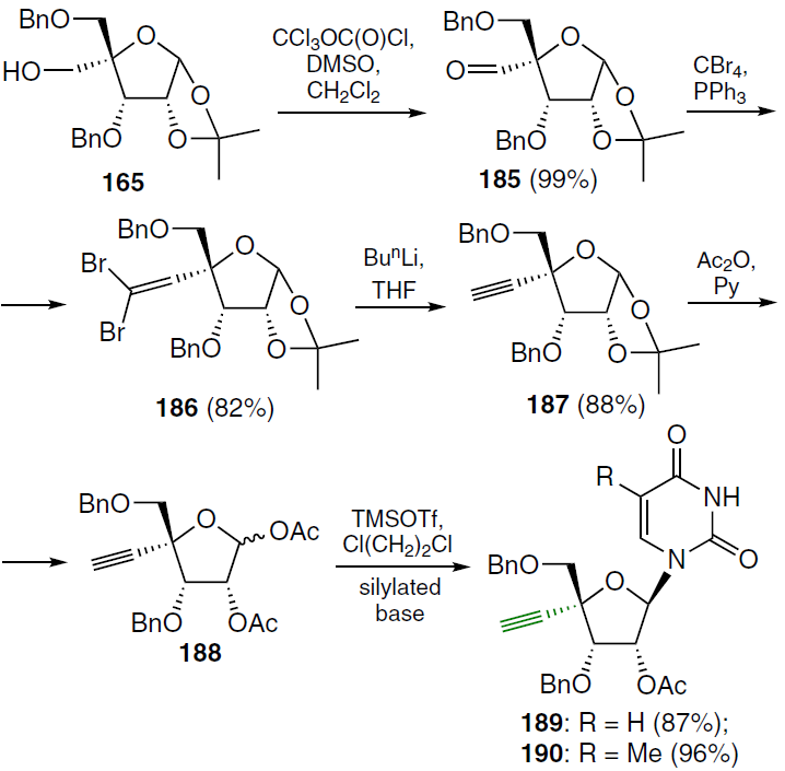 A series of nucleosides with an acetylene group at the 4' position of the carbohydrate moiety were obtained.[136] The synthesis of such compounds involved several steps (Scheme 35). In the first step, the starting riboside 165 (Ref. 128) was oxidized with a DMSO-diphosgene mixture in dichloromethane, which gave 4-aldehyde 185 in quantitative yield. It was treated with CBr4 and PPh3 under the Wittig reaction conditions to afford 4-(2,2-dibromovinyl) derivative 186. Treatment of the latter with n-butyllithium in THF gave 4-ethynyl-containing carbohydrate 187, which was hydrolyzed and then acetylated with the Ac2O-Py system to form the 1,2-di-O-acetyl derivative 188 (yield 88%). Further condensation with a silylated pyrimidine base (thymine or uracil) was carried out in the presence of TMSOTf in 1,2-dichloroethane. Uracil (189) and thymine (190) derivatives were isolated in high yields.[136]