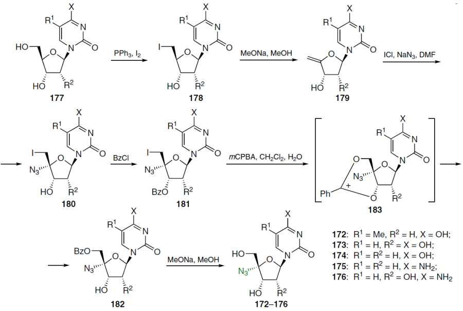 The conversion of the iodine atom at position 5' to a hydroxyl group is the greatest challenge. The reactivity of this iodine atom is reduced if the 4' carbon atom contains an electron-withdrawing substituent (e.g., an oxygen atom). To stabilize the nucleoside, it should be converted to 3'-O-benzoyl derivative 181 via esterification, after which the iodine atom can be activated by oxidation to the corresponding hypervalent state. Treatment of 4'-C-azido-3'-O-benzoyl-5'-deoxy-5'-iodine nucleoside 181 with m-chloroperoxybenzoic acid (mCPBA) in water-saturated dichloromethane was found to yield a number of products, with 5'-O-benzoyl-3'-hydroxy derivative 182 being isolated as the major component of the mixture (see Scheme 33). This compound is likely formed from the 3',5'-cyclic benzoxonium ion 183 by hydrolysis. The target nucleosides 172 – 176 were obtained in the individual state by hydrolysis of compounds 182 in the presence of a base followed by chromatographic purification.[134]