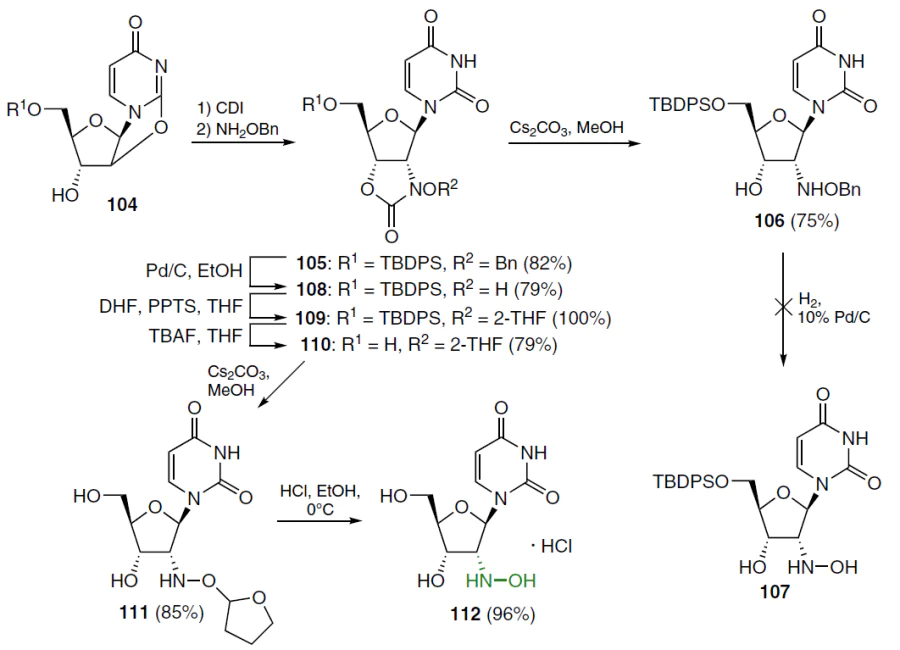 In an alternative method, hydrogenation of precursor 105 under the same conditions gave hydroxylamine 108. After protecting its N-hydroxy group with a tetrahydrofuran-2-yl (2-THF) moiety, compound 109 was obtained. The 5'-O-silyl group in this compound was removed with TBAF. Cleavage of the cyclic carbamate moiety in derivative 110 with CsCO3 in MeOH afforded analogue 111. Cleavage of tetrahydrofuranyl protecting group in the presence of 10% HCl in EtOH furnished the desired 2'-hydroxylamino-2'-deoxyuridine (2'-DHAU, 112) as the hydrochloride (see Scheme 20).[79][80]