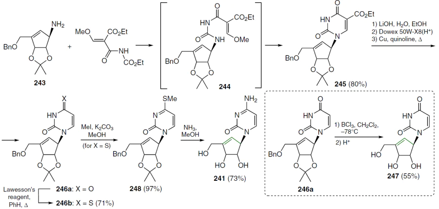 The synthesis of (1R,4R,5S)-1-[4,5-dihydroxy-3-(hydroxymethyl)-2-cyclopenten-1-yl]cytosine (241)* and a similar carbocyclic derivative of uracil was described by Lim et al.[199] Cyclopentenyl nucleosides were synthesized from optically pure 3-aminocyclopentene 243, obtained according to a previously described method[200] (Scheme 49). Condensation of the starting compound 243 with ethyl-(Z)-2-[(ethoxy- carbonyl)carbamoyl)-3-methoxyacrylate in the presence of triethylamine in ethanol gave intermediate 244, which was then cyclized to uracil derivative 245 in 80% yield. Further hydrolysis of compound 245 with LiOH in a water–methanol mixture followed by neutralization with Dowex 50W-X8 ion exchange resin in the H+ form yielded an intermediate carboxylic acid, which was decarboxylated without purification in the presence of copper powder in boiling quinoline to afford the protected uridine analogue 246a. Debenzylation of the latter with boron trichloride in dichloromethane was accompanied by removal of the isopropylidene group during subsequent workup and gave (1R,4R,5S)-1-[4,5-dihydroxy-3-(hydroxymethyl)-2-cyclopenten-1-yl]uracil (247) in moderate yield.[199]