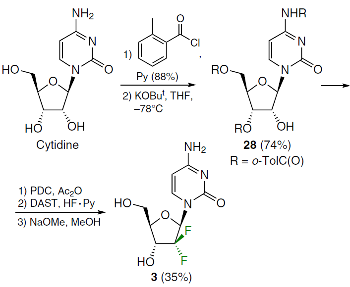 Gemcitabine (3)[14][33-37] is a 2',2'-difluorinated cytidine analogue marketed as the hydrochloride salt under the trade name Gemzar for the treatment of cancers such as non-small cell lung cancer, ovarian cancer, bladder cancer, pancreatic cancer, and breast cancer. In recent years, the need for effective methods for producing gemcitabine has increased significantly. The synthesis of gemcitabine (3) was patented[38] comprising the following sequence of transformations: complete protection of the NH2 and OH groups of cytidine with o-toluoyl chloride (o-TolC(O)Cl) followed by regioselective deprotection of position 2', oxidation of compound 28 with pyridinium dichromate (PDC), fluorination with diethylaminosulfur trifluoride (DAST) in the HF – pyridine (Py) system, and removal of the protecting groups with sodium methoxide (Scheme 1).